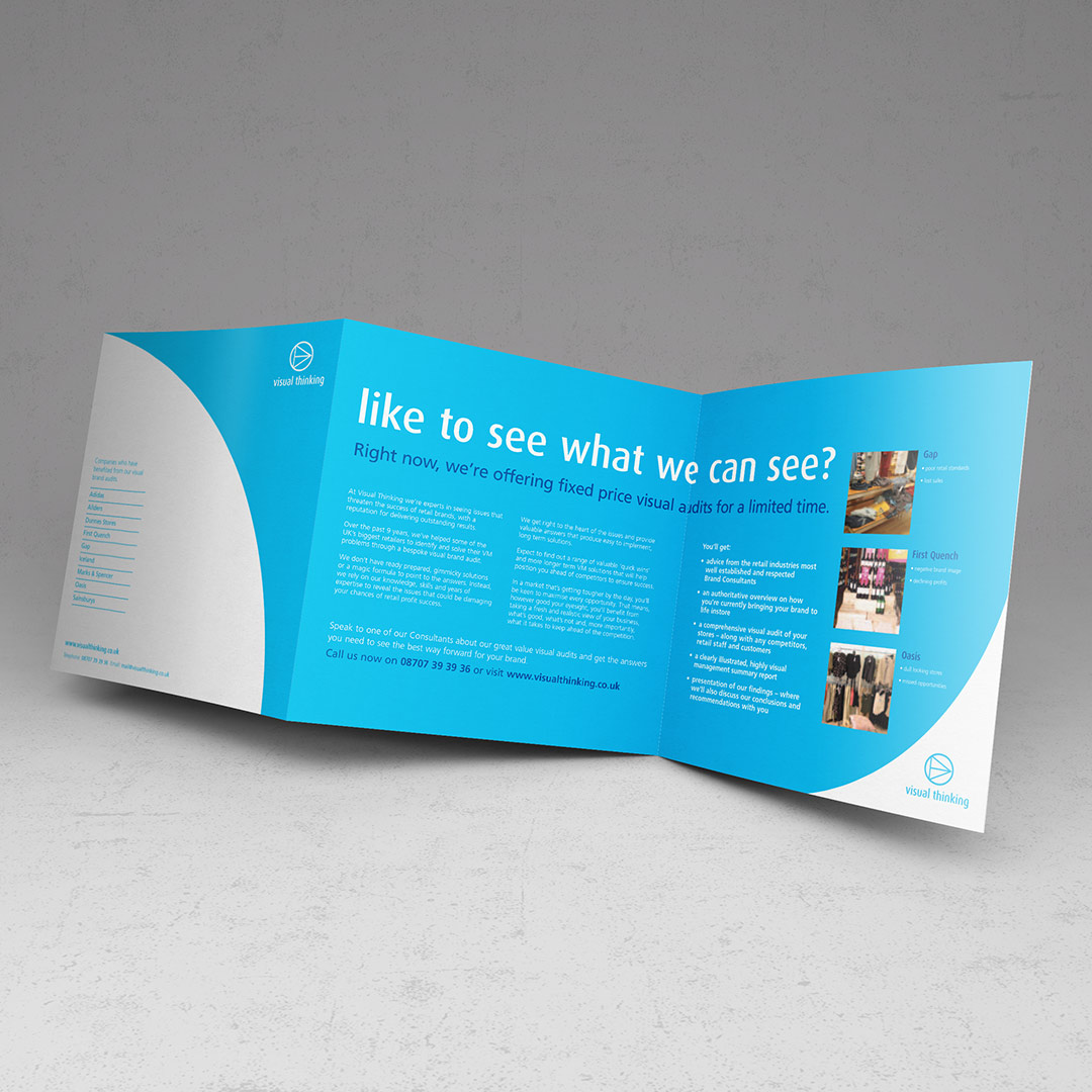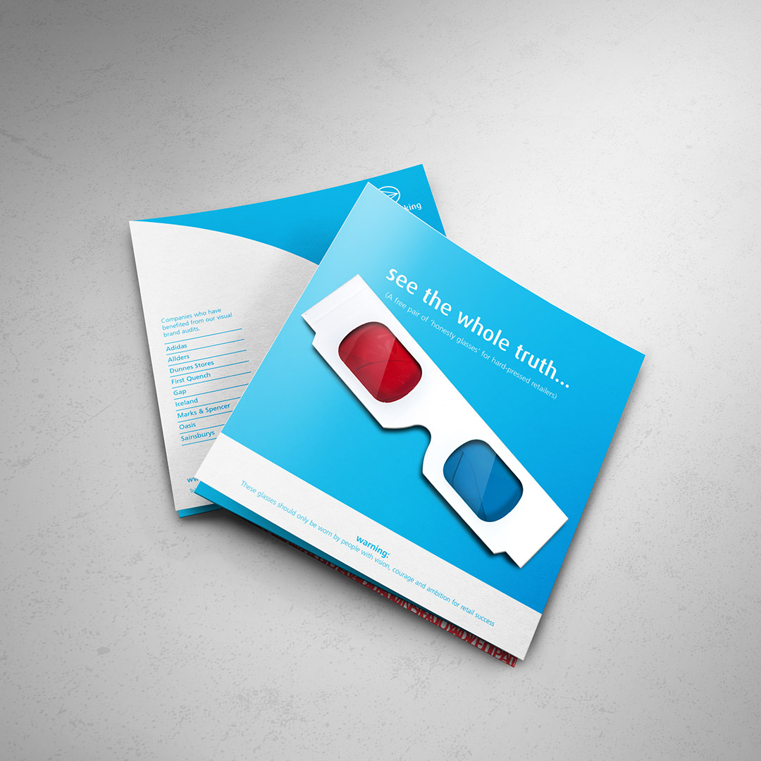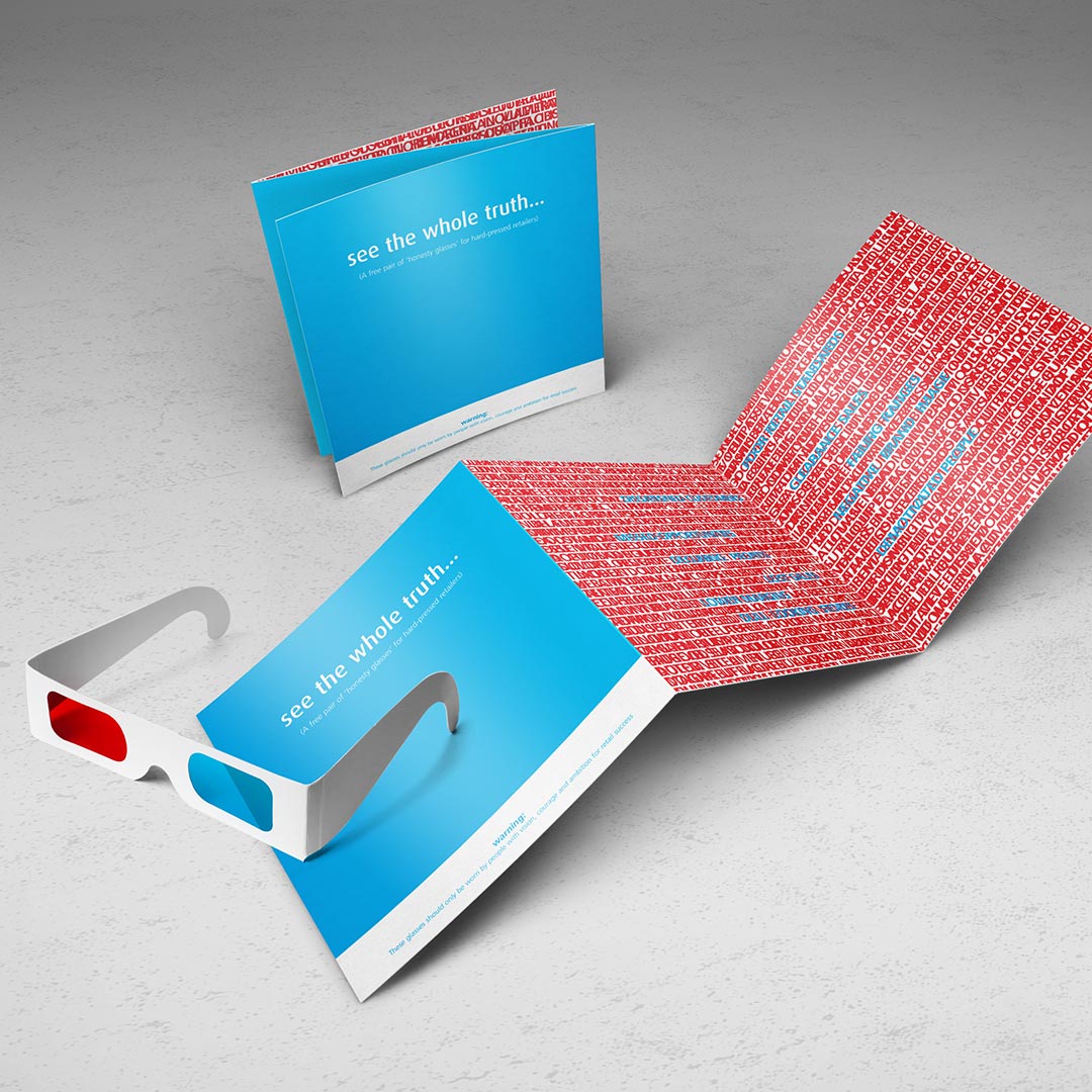Some examples of direct mail I designed for Visual thinking, a retail agency specialising in instore merchandising. The initial project was a campaign mail-out developing the concept of ‘hidden potential’, including a pair of 3D ‘honesty glasses’ revealing best practice messages hidden on a jumbled inside spread.