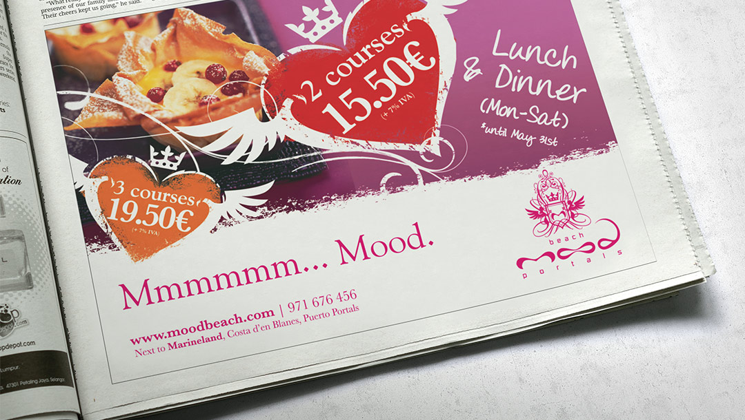 I created the original (generation 1) branding/visual identity for Mood's printed media by mimicking the beachclub's summer environment; using a palette of bright, sunsoaked colours, opulent golds and distressed, weathered finishes.
