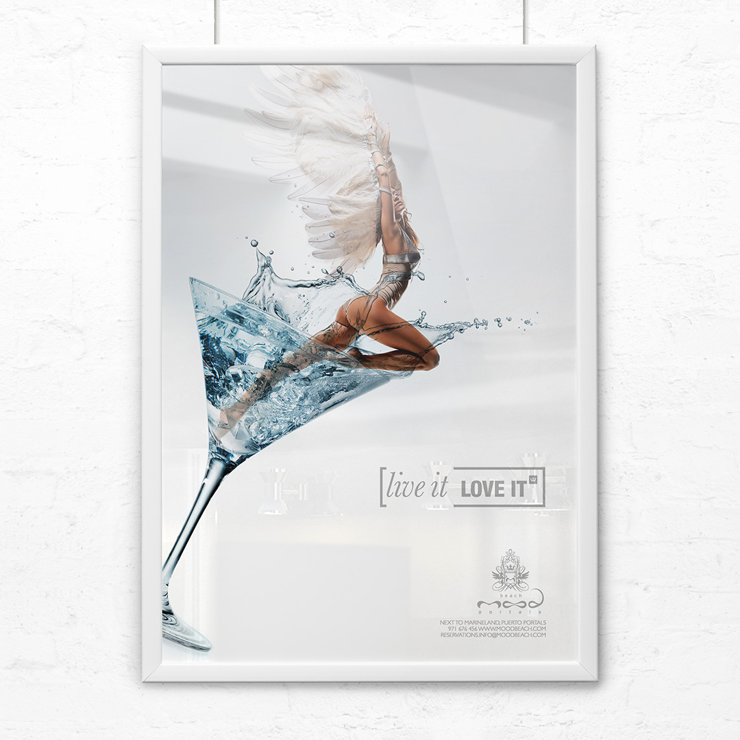 For advertising, visual communication and messaging needed to be more direct and necessitated cleaner styling; using aspirational copywriting and sexy imagery playing on elements of the Mood logo - typeface and angel.