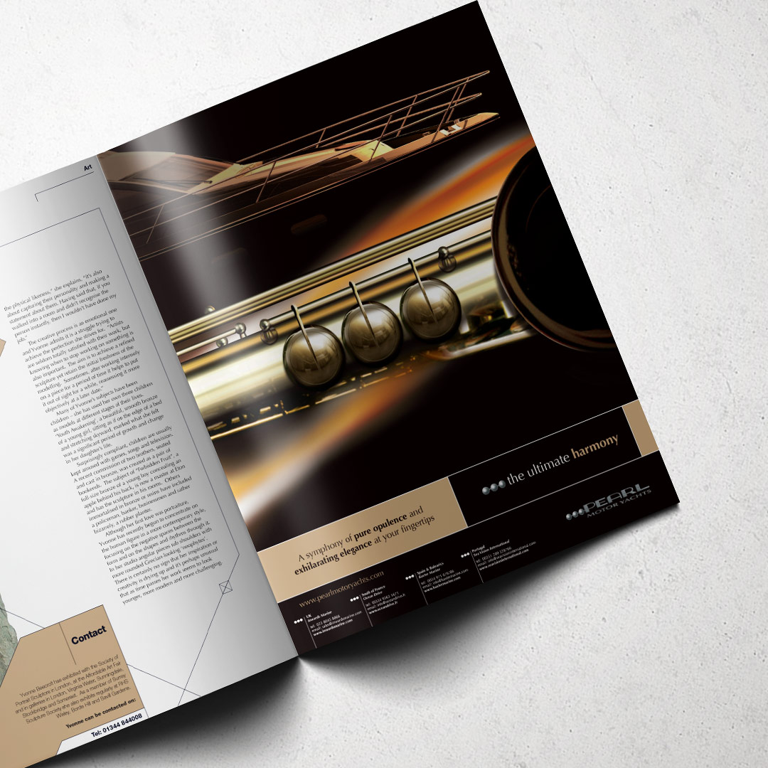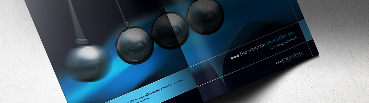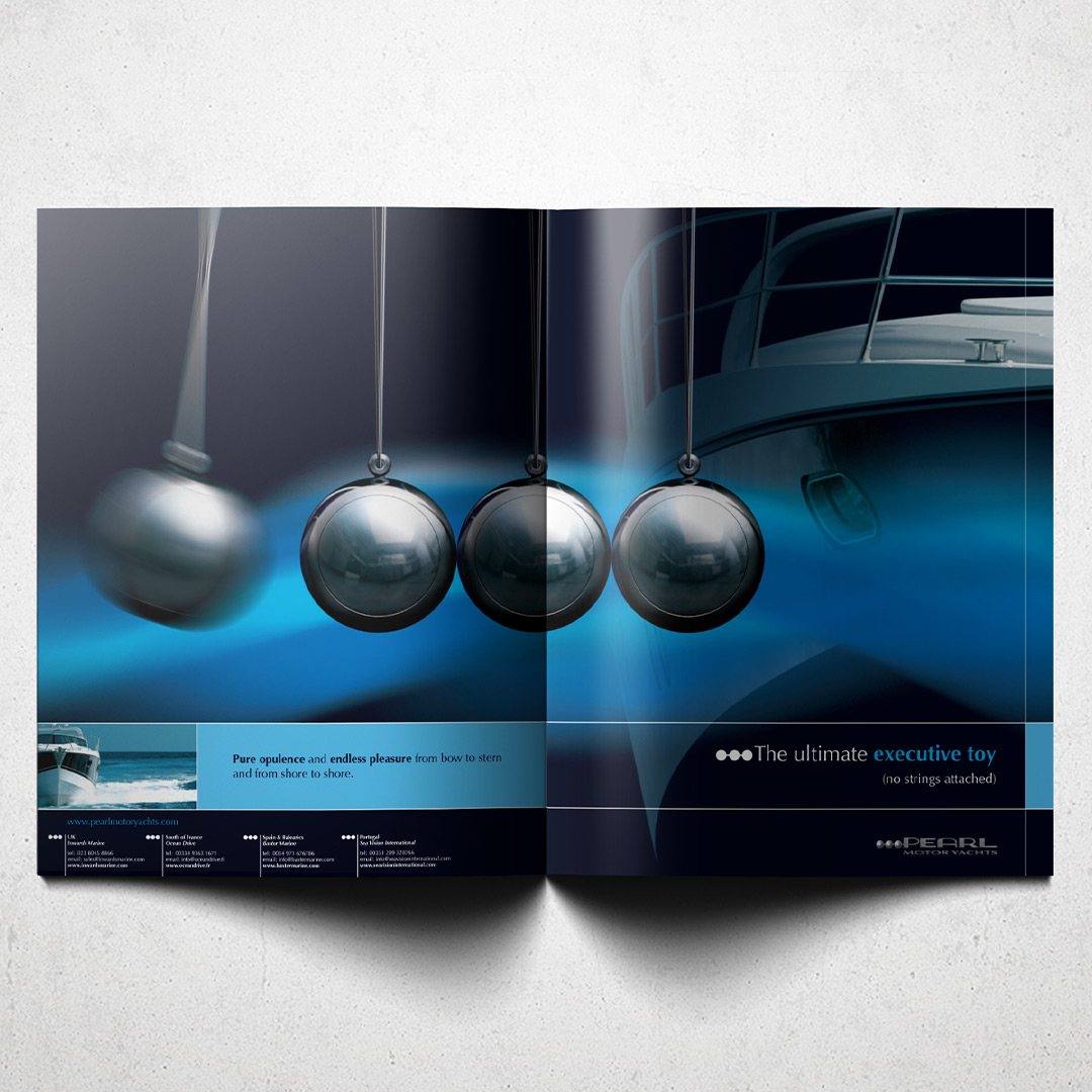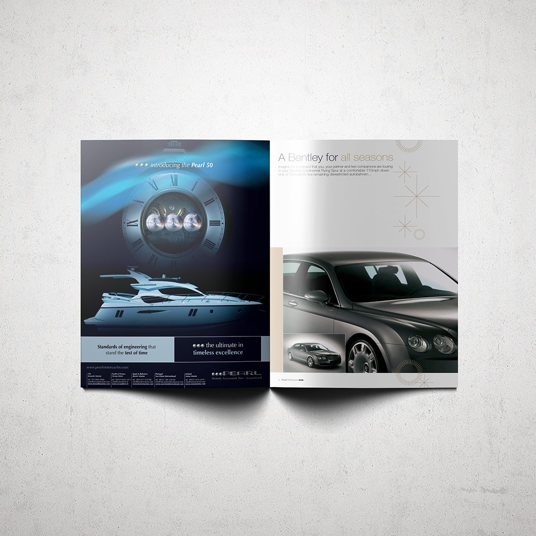 Advertising brand identity for Pearl, a manufacturer of luxury motor yachts, implemented across international magazine advertising and printed literature. A suite of adverts which developed the aesthetic of the 3 pearls from the company logo, applying them in a series of aspirational scenarios.